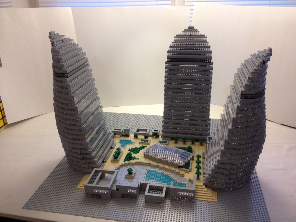 | Here is the completed LEGO Flame Towers model. It turned out almost just like I planned. Whew! Considering the logistics of it all, it was a complete success! |